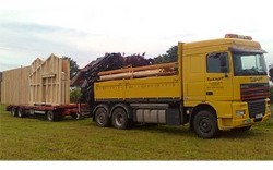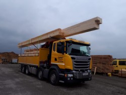 Mit diesem Fahrzeug können normale sowie Sondertransporte durchgeführt werden. Wir transportieren unter anderem Holzriegelwände, Eisenrohre, Container, Maschinenteile, Betonelemente oder alle Arten von Eisenkonstruktionen.